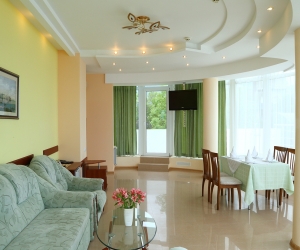 Площадь номера: 70 кв. мВ номере: двуспальная кровать (ширина 1,8 м), шкаф-купе с зеркалом, угловой двуспальный диван-кровать, кресло кровать, обеденный стол на 4-е персоны, журнальный столик, прикроватные тумбочки, совмещенный санузел с душевой кабиной, фен, терраса: видовой солярий 20 кв. м.