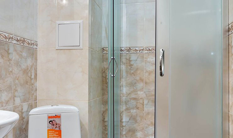 -в ванной комнате: душевая кабина, туалетные принадлежности, фен;