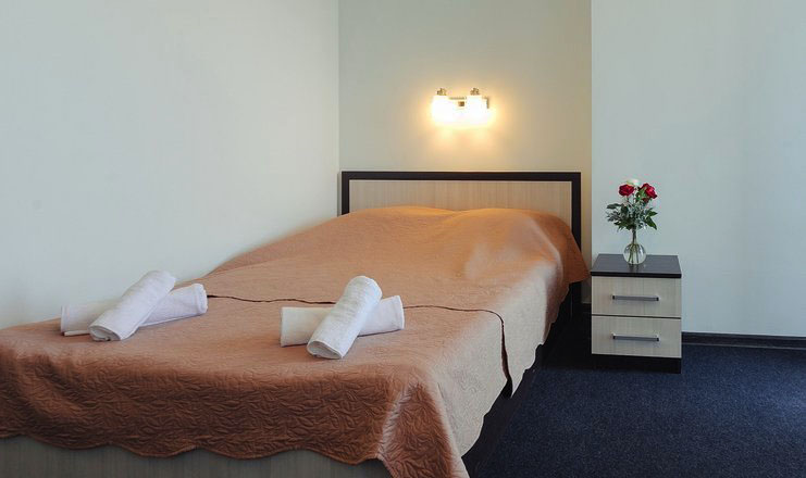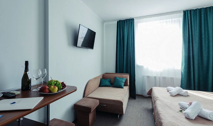 -в номере: вешалка, диван или кресло-кровать, зеркало, кровать односпальная 2, прикроватные тумбочки, пуфик, стол, шкаф, кондиционер, телевизор, холодильник, чайный набор посуды;