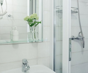 -в ванной комнате: душевая кабина, фен
