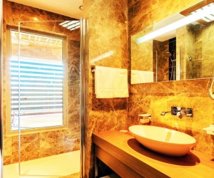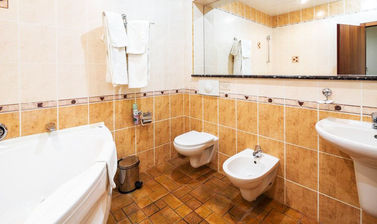 -в ванной комнате: ванна и душевая кабина, тапочки, туалетные принадлежности, фен