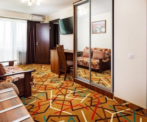 -в номере: вешалка, диван, зеркало, ковровое покрытие, кровать двуспальная, прикроватные тумбочки, столик журнальный,