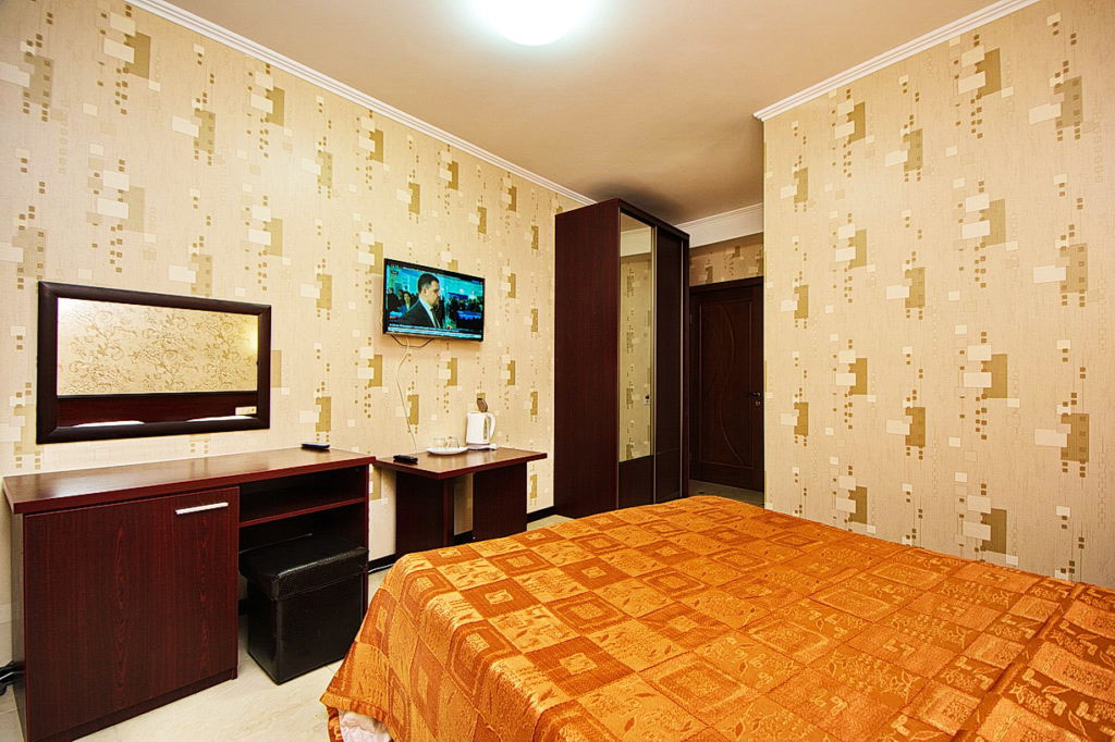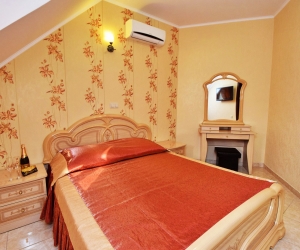 В спальне: двуспальная кровать, раскладное кресло, прикроватные тумбочки, туалетный столик, ЖК-телевизор, кондиционер, балкон.