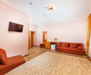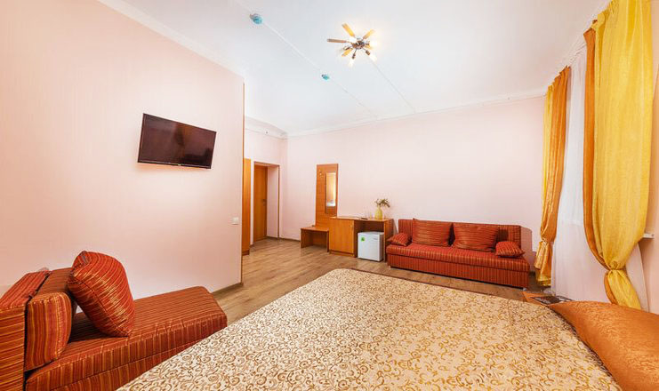 -в номере: вешалка, диван раскладной, зеркало, кровать двуспальная, прикроватные тумбочки, стол,
