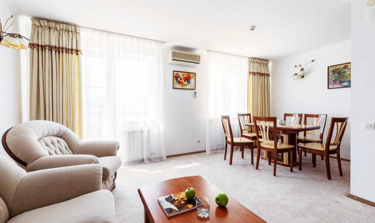 столик туалетный, стулья, шкаф, мини-кухня, сплит-система, телевизор, холодильник, чайный набор посуды, электрочайник;