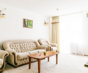 -в номере: вешалка, диван раскладной, зеркало, кровать двуспальная, прикроватные тумбочки, столик журнальный,