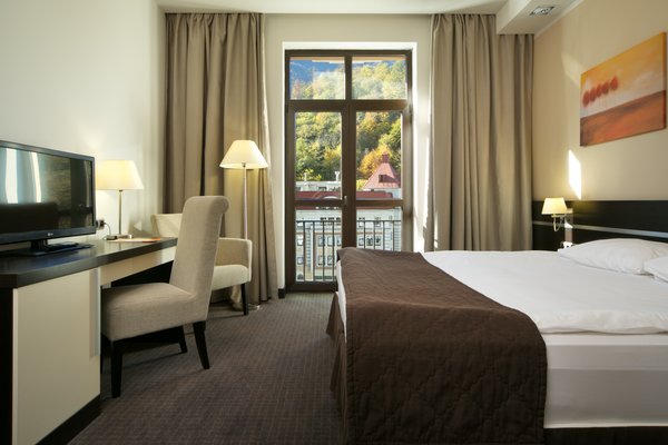 Внушительное здание девятиэтажного отеля возвышается среди живописных Кавказских гор, а из его окон открываются виды на завораживающие пейзажи Кавказских гор.