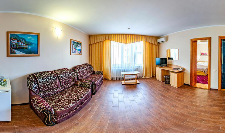 -в номере: вешалка, диван, зеркало, кровати односпальные /одна двуспальная кровать, прикроватные тумбочки, пуфик, стол, шкаф, кондиционер, сейф, телевизор, телефон, холодильник, чайный набор посуды;