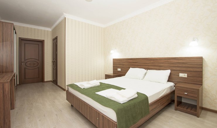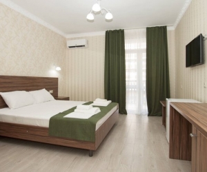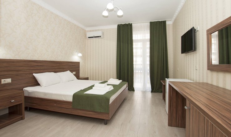 -в номере: вешалка, зеркало, кровать двуспальная, кровать односпальная, прикроватные тумбочки, стол, столик журнальный, столик туалетный, шкаф, набор посуды, сплит-система, телевизор, холодильник;