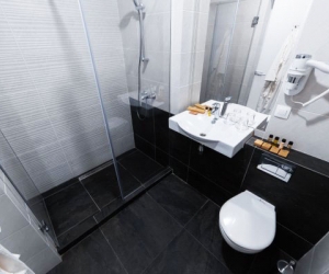Санузел с душем, туалетными принадлежностями, феном и халатами;