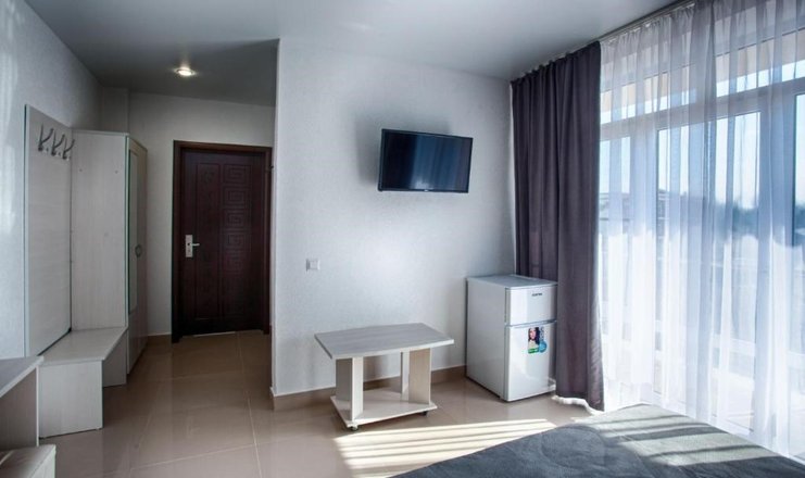 -в номере: вешалка, диван, зеркало, кровать двуспальная, кровать односпальная, прикроватные тумбочки, стол, стулья, шкаф, мини-холодильник, набор посуды, сплит-система, телевизор;