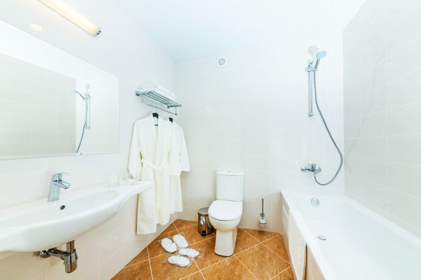 Санузел с ванной, тапочки, туалетные принадлежности, фен;