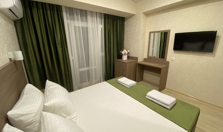 -в номере: вешалка, диван, зеркало, кресло, кровать двуспальная, прикроватные тумбочки, стол, стулья, шкаф, кондиционер, мини-холодильник, набор посуды, сейф, телевизор;