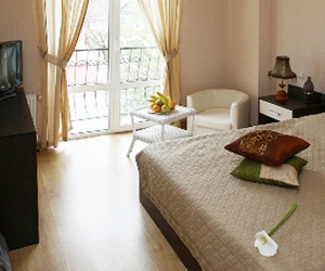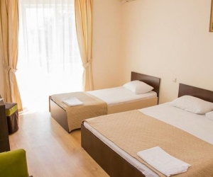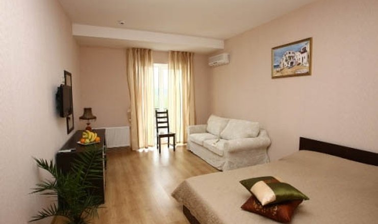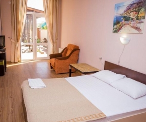 -в номере: вешалка, зеркало, кровать двуспальная, кровать односпальная, набор плетеной мебели, прикроватные тумбочки, стол, тумба, шкаф, набор посуды, сплит-система, телевизор, холодильник;