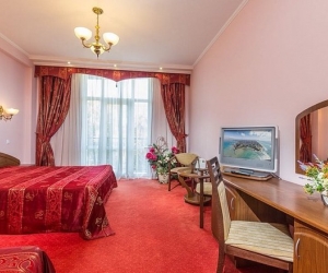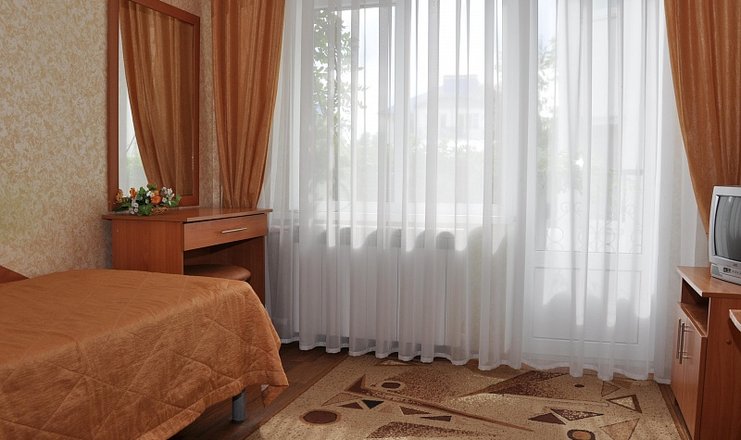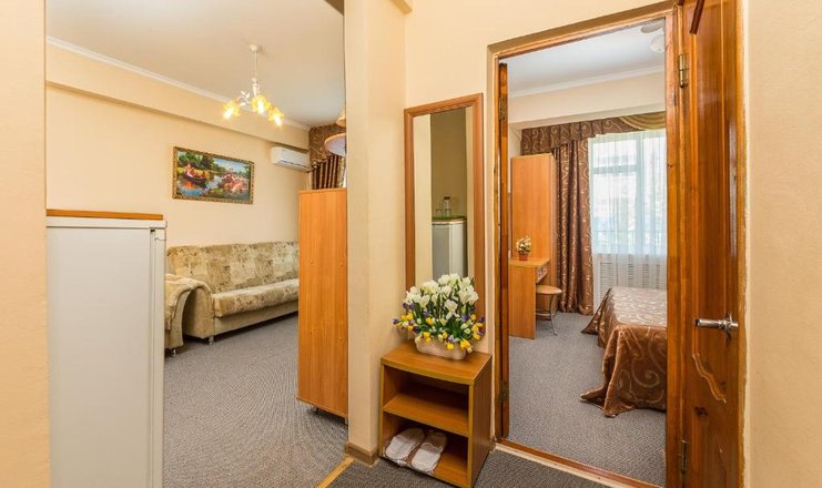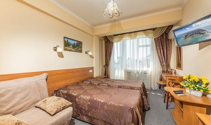 -в номере: вешалка, диван раскладной, зеркало, кровати односпальные /одна двуспальная кровать, набор мягкой мебели, обувная полка, прикроватные тумбочки, стол, столик журнальный, столик туалетный, стулья, шкаф, набор посуды, сейф, сплит-система, телевизор, холодильник, электрочайник;