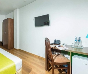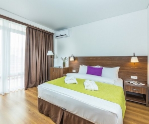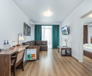 -в номере: вешалка, диван, зеркало, кровать двуспальная, набор мягкой мебели, прикроватные тумбочки, стол, стулья, шкаф, мини-холодильник, набор посуды, пляжные полотенца, сейф, сплит-система, телевизор ЖК, чайный набор посуды, электрочайник;