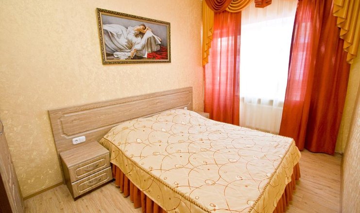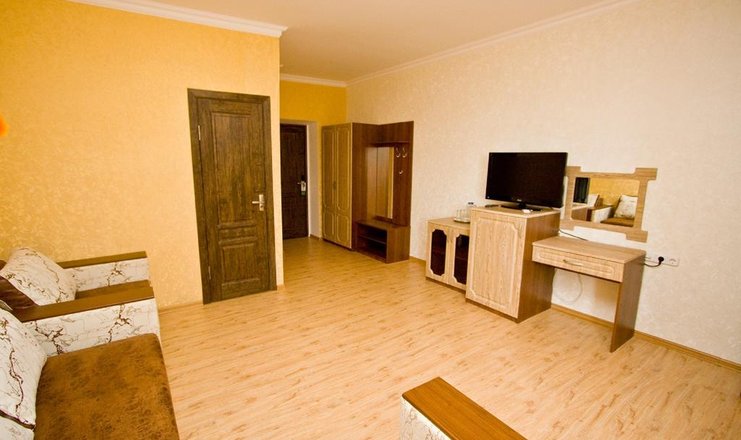 -в номере: вешалка, зеркало, кровать двуспальная, набор мягкой мебели, прикроватные тумбочки, стол, стул, шкаф, мини-холодильник, сплит-система, телевизор ЖК;