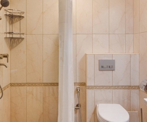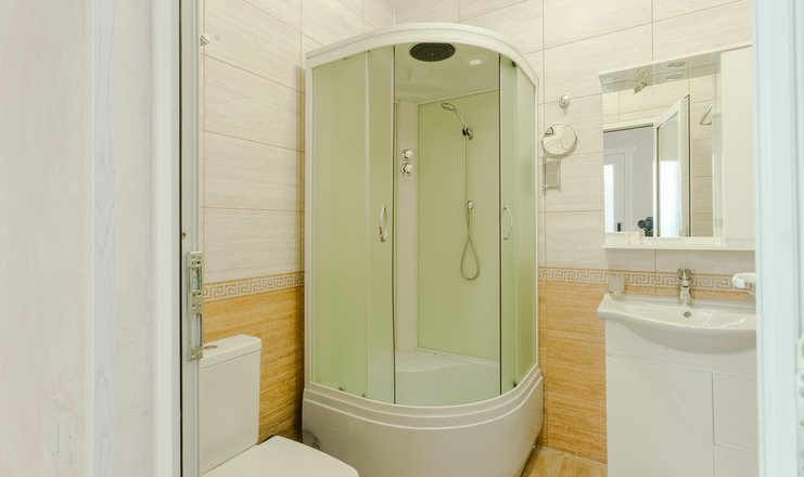 -в ванной комнате: душевая кабина, тапочки, туалетные принадлежности, фен, халат;