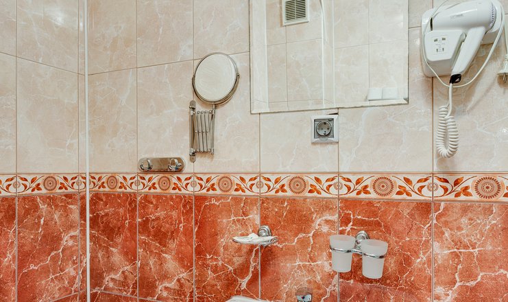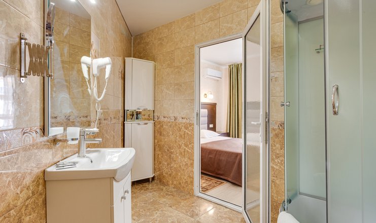 -в номере: вешалка, зеркало, кровать двуспальная, кровать односпальная, прикроватные тумбочки, стол, стул, шкаф, гладильная доска, мини-холодильник, набор посуды, сейф, сплит-система, телевизор ЖК, чайный набор посуды, электрочайник;