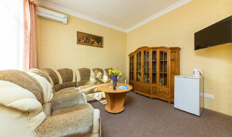 В номере: вешалка, диван, зеркало, кресло, кровать двуспальная, обувная полка, прикроватные тумбочки, столик журнальный, столик туалетный, стулья, шкаф, шкаф для посуды, сейф, сплит-система, телевизор ЖК, холодильник, электрочайник, ванна, туалетные принадлежности, фен;