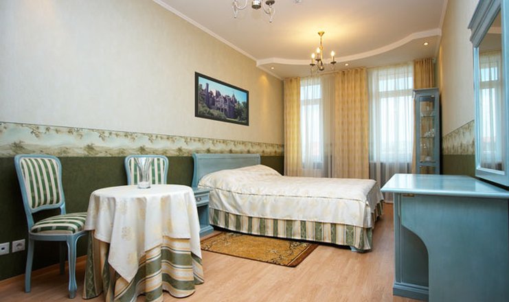 В номере: диван или кресло, зеркало, комод, кровати односпальные /одна двуспальная кровать, прикроватные тумбочки, стол, столик журнальный, стулья, шкаф, кондиционер (система кондиционирования с индивидуальным контролем), набор посуды, телевизор ЖК, холодильник, ванна, тапочки, туалетные принадлежности, фен, халат;