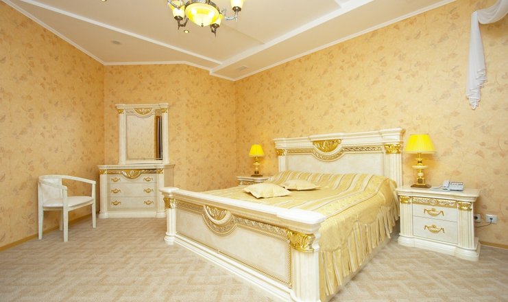 В номере: диван или кресло, зеркало, комод, кровать двуспальная, прикроватные тумбочки, столик журнальный, стулья, шкаф, кондиционер (система кондиционирования с индивидуальным контролем), набор посуды, телевизор ЖК, холодильник, душевая кабина, тапочки, туалетные принадлежности, фен, халат;