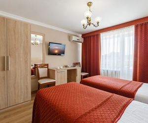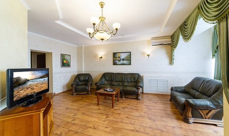 В номере: вешалка, зеркало, кресло, кровать двуспальная, прикроватные тумбочки, стол, столик журнальный, стулья, шкаф, мини-кухня, мини-холодильник, набор посуды, сплит-система, телевизор, электрическая плита, электрочайник, ванна, тапочки, туалетные принадлежности, фен, халат;