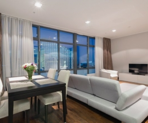 -в номере: гардеробная, диван, кресла, кровати односпальные /одна двуспальная кровать, прикроватные тумбочки, стол, стол для компьютера, столик журнальный, столик туалетный, стулья, шкаф, микроволновая печь, набор посуды, стиральная машина, телевизор, холодильник, электрическая плита, электрочайник, ванна в 2-х санузлах, туалетные принадлежности, фен