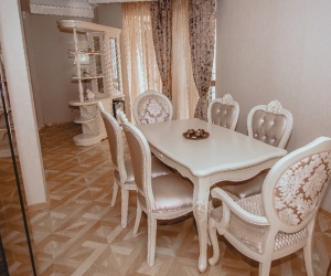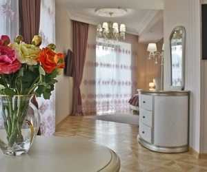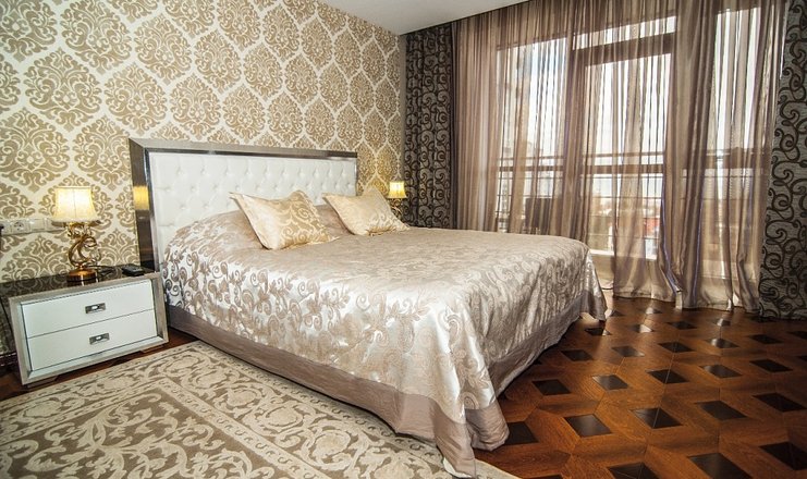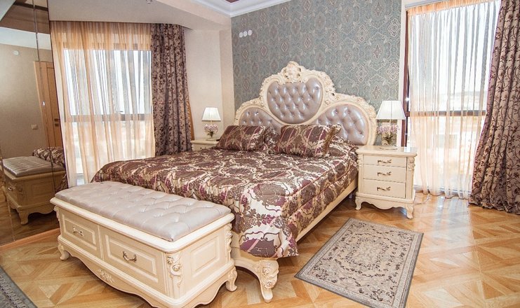 В номере: вешалка, зеркало, кресла, кровать двуспальная, кухонная мебель, прикроватные тумбочки, стулья, шкаф, набор посуды, сейф, система общего кондиционирования, телевизор ЖК, холодильник, электрочайник ,2 санузла с джакузи, тапочки, туалетные принадлежности, фен, халат;