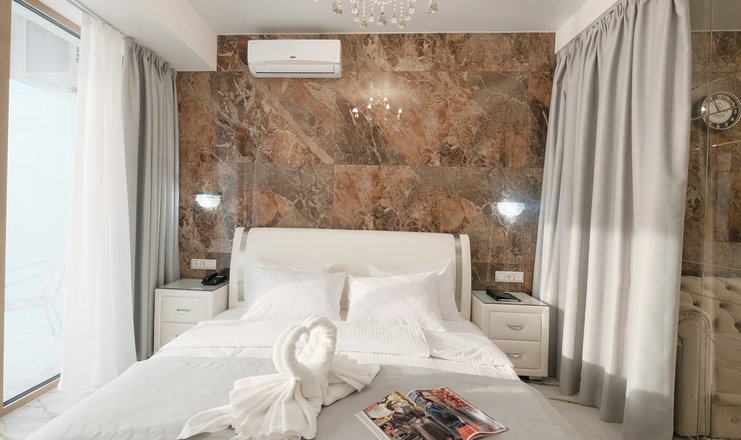 -в номере: вешалка, зеркало, кровать двуспальная, прикроватные тумбочки, шкаф, кондиционер, сейф, телевизор ЖК, холодильник;