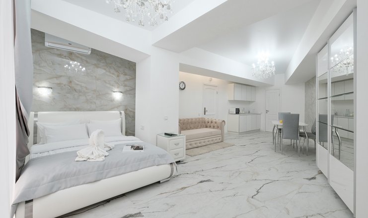 -в номере: вешалка, зеркало, кровать двуспальная, набор мягкой мебели, прикроватные тумбочки, шкаф, кондиционер, сейф, телевизор ЖК, холодильник;