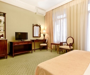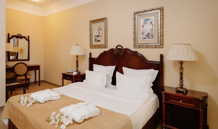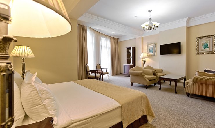 -в номере: вешалка, зеркало, кровать двуспальная, набор мягкой мебели, прикроватные тумбочки, стол, стул, шкаф, кондиционер, сейф, телевизор ЖК;
