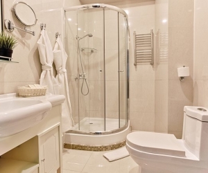-в ванной комнате: душевая кабина, туалетные принадлежности, фен;