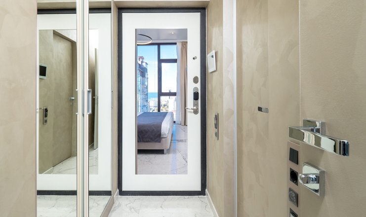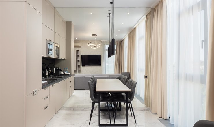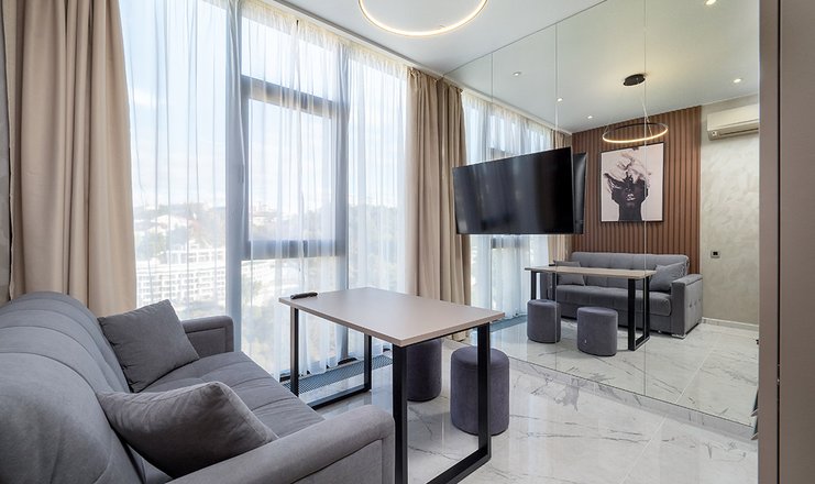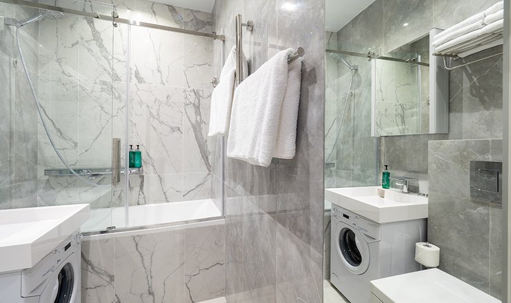 В номере: вешалка, зеркало, кровать двуспальная, прикроватные тумбочки, стол, стулья, шкаф, кофемашина, микроволновая печь, набор посуды, сплит-система, стиральная машина, телевизор ЖК, холодильник, электрочайник, ванна/душ, туалетные принадлежности, фен;