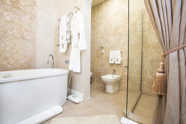 Санузел с ванной и душевой кабиной, тапочки, туалетные принадлежности, фен, халат;