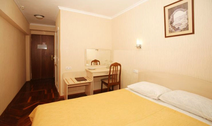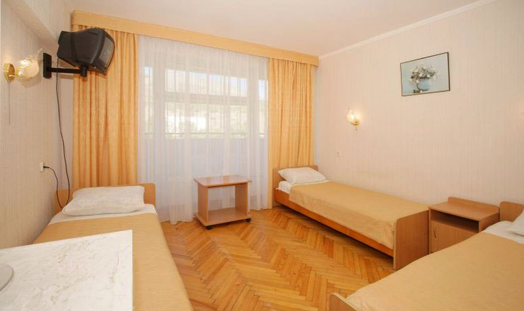 -в номере: зеркало, кровати односпальные, прикроватные тумбочки, стол, стулья, шкаф, кондиционер, телевизор, холодильник;