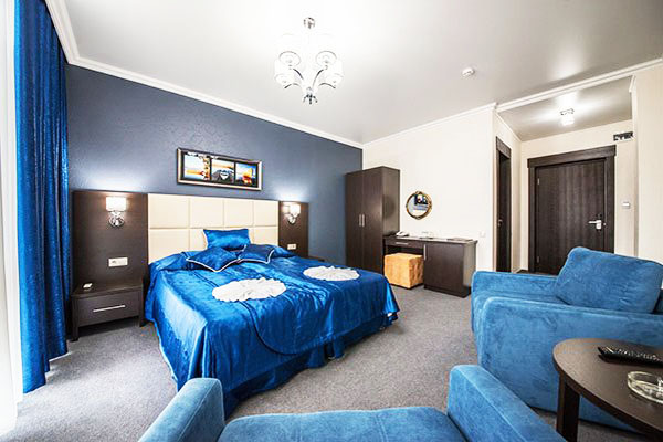 В номере: диван, зеркало, кресла, кровать двуспальная, прикроватные тумбочки, стол, стулья, шкаф;  мини-холодильник, набор посуды, сплит-система, телевизор ЖК, телефон; санузел с ванной, туалетные принадлежности, фен, халат; Wi-Fi бесплатно
