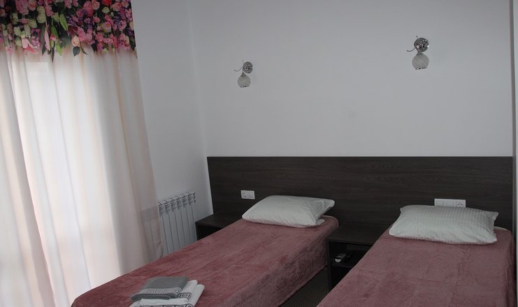 -в номере: вешалка, зеркало, кровати односпальные /одна двуспальная кровать, прикроватные тумбочки, стол, стулья, шкаф, сплит-система, телевизор, холодильник;