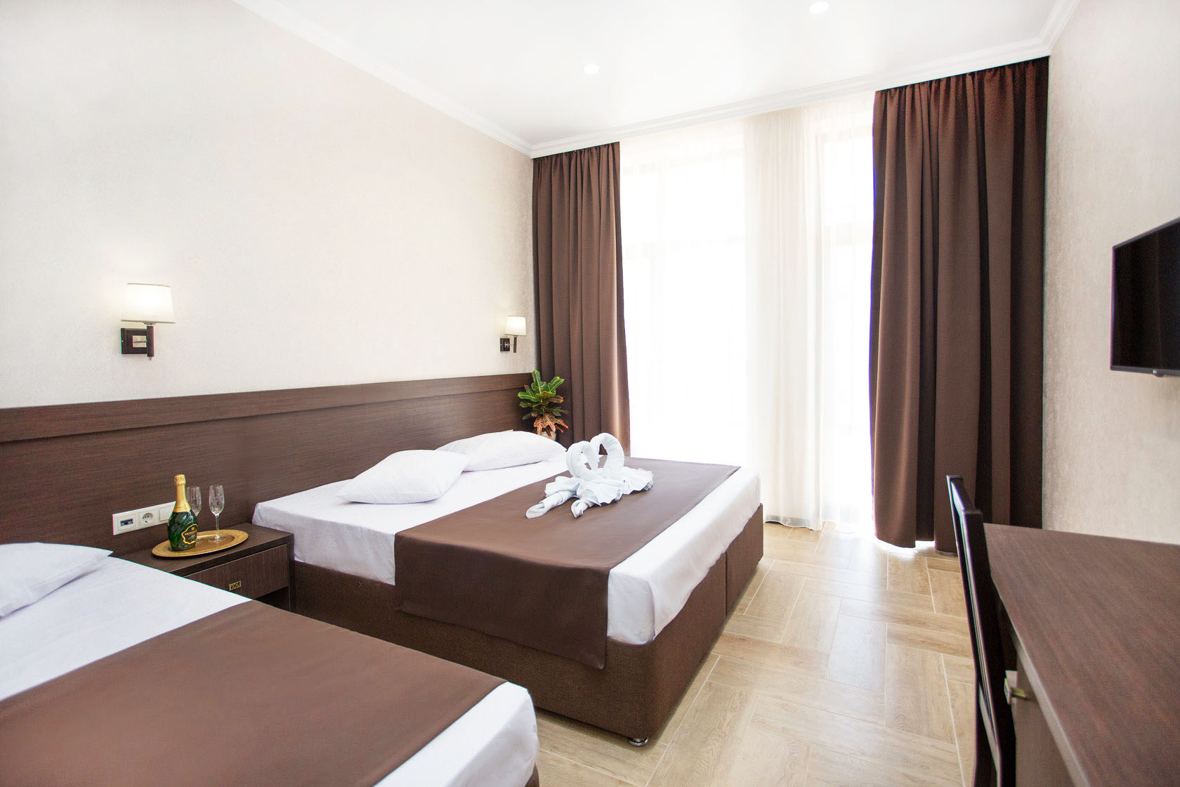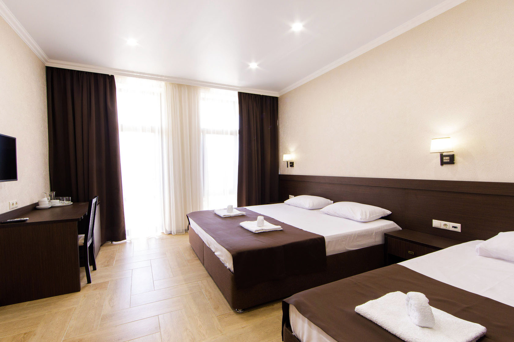 -из мебели в номере предусмотрено: двуспальная кровать, кресло раскладное, диван раскладной, гардероб с вешалками, прикроватная тумбочка, стол, стул;