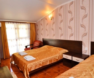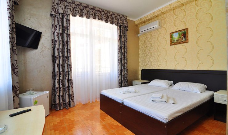 -в номере: зеркало, кровати односпальные /одна двуспальная кровать, прикроватные тумбочки, стол, стулья, шкаф, набор посуды, сплит-система, телевизор ЖК, холодильник;