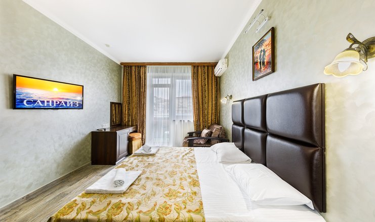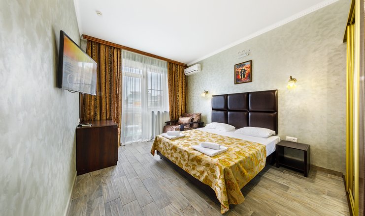 -в номере: вешалка, зеркало, кресло-кровать, кровать двуспальная/ две полутороспальные кровати, прикроватные тумбочки, пуфик, стол, стулья, трюмо, шкаф, мини-холодильник, набор посуды, сплит-система, телевизор ЖК, электрочайник;