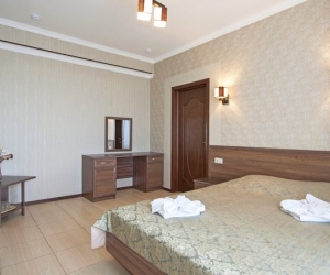 -в номере: вешалка, кровати односпальные, кровать двуспальная, прикроватные тумбочки, столик журнальный, столик туалетный, стулья, шкаф, мини-холодильник, набор посуды, сплит-система, телевизор;