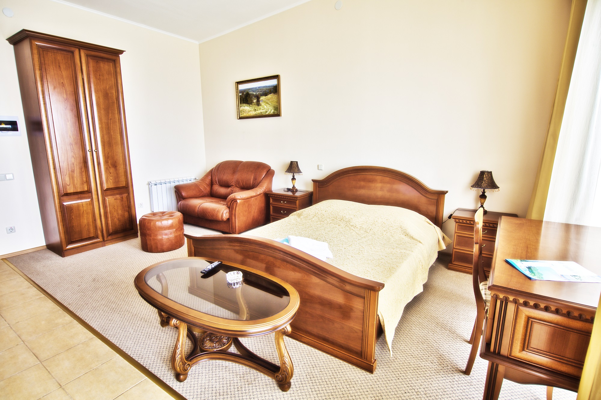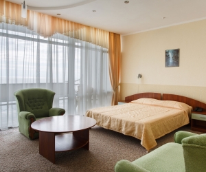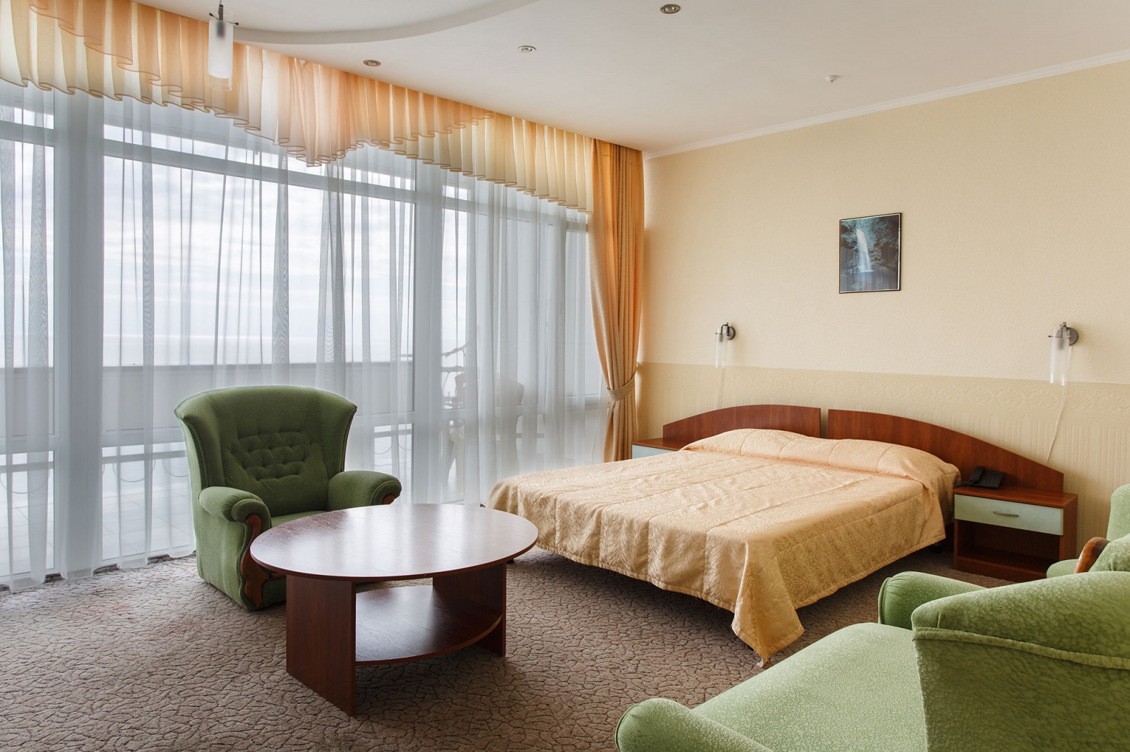 В номере: двуспальная кровать, диван, ТВ (спутниковое), кондиционер, холодильник, телефон, утюг, электрочайник, набор посуды, набор мебели, туалет, умывальник, фен, душевая кабина, мини сауна