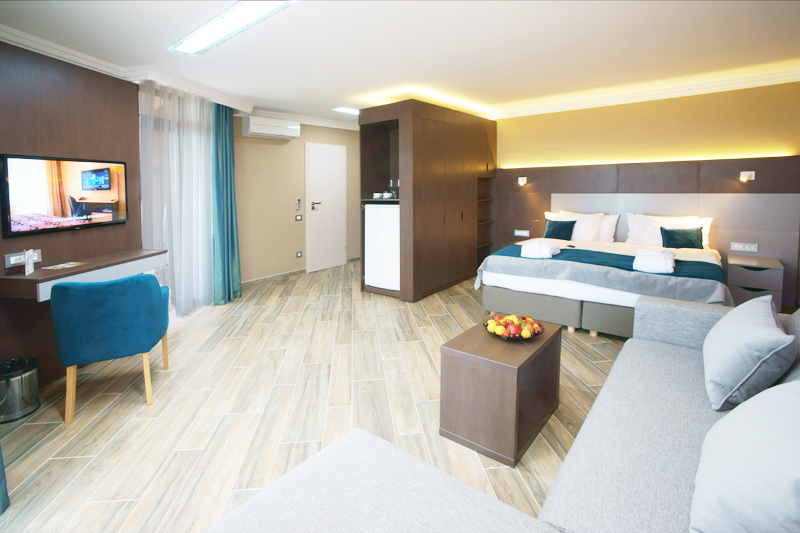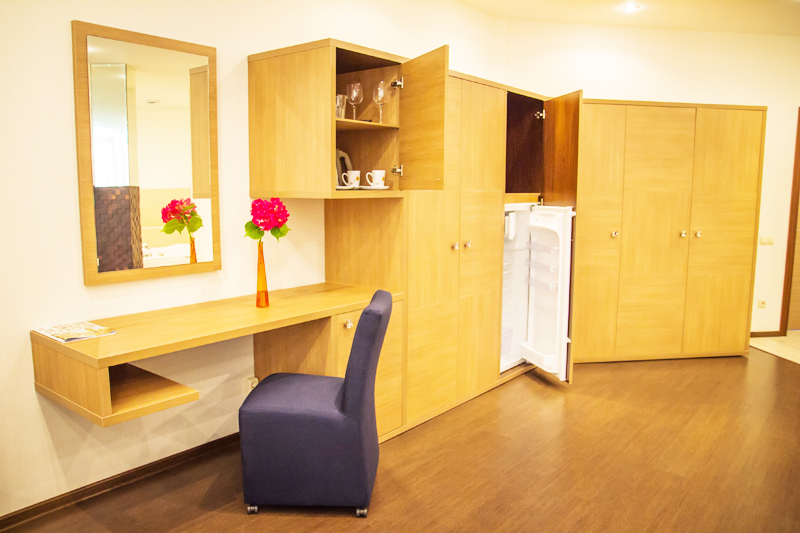 В номере: телевизор, кондиционер, душ, халаты, тапочки, холодильник, банные принадлежности, балкон, кухня/мини-кухня, электрочайник, микроволновая печь, сейф, мягкая мебель, гладильная доска, туалет