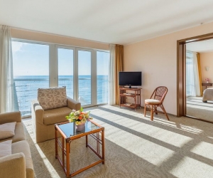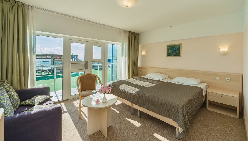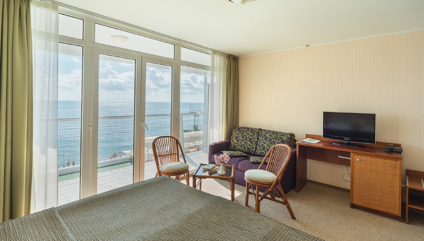 Площадь номера: 50 кв. мВ номере: телевизор, кондиционер, ванна, биде, балкон, мини-бар, сейф, телефон, мягкая мебель, 2-спальная кровать, туалет, в номере ковровое покрытиеДоп. место - диван-кроватьВид на море