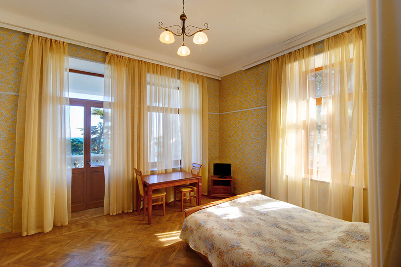 В номере: wi-fi, ванна, махровые халаты, туалет, LCD телевизор, кондиционер, холодильник, двуспальная кровать, большая лоджия 17 кв.м. (стол, стулья из красного дерева), сейф
