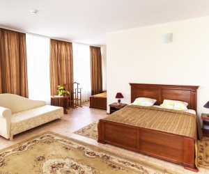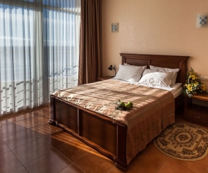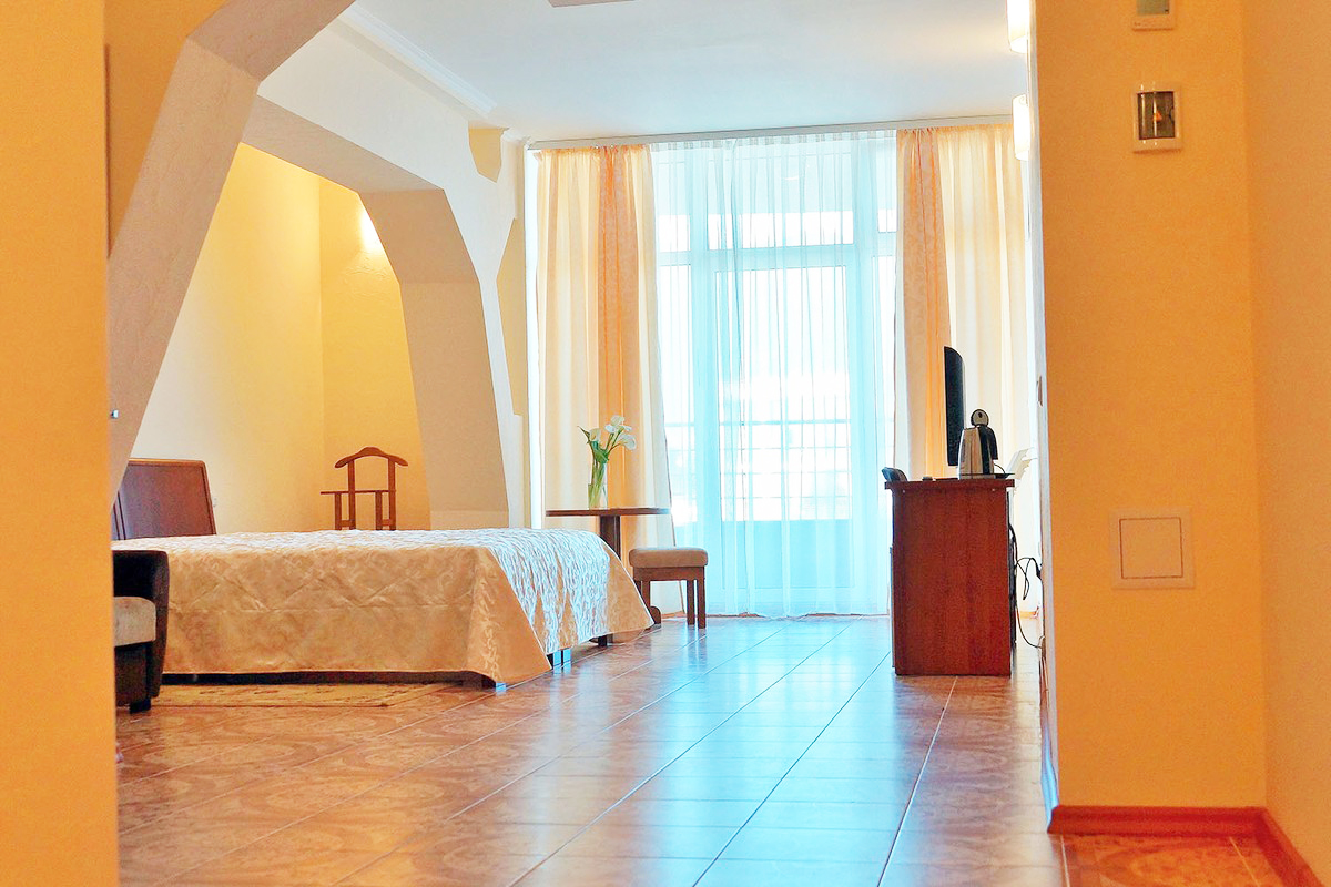 В номере: спальня, гостиная, двуспальная кровать, 2 совмещенных санузла, душевая кабина, ванна, Набор полотенец (4 шт. для каждого гостя), махровые халаты, тапочки, набор косметики (гель для душа, мыло, шампунь, натуральная крымская соль для ванны), прикроватные тумбочки, шкаф, мягкий уголок, журнальный столик, 2 пуфика, плазменный телевизор, мини-бар, набор посуды, сейф, фен, кондиционер, балкон с мебелью