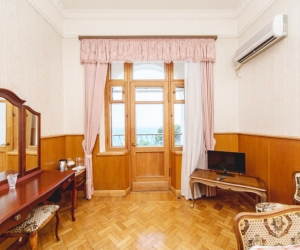 В номере: прихожая, гостиная, спальная комната с двуспальной либо двумя раздельными кроватями, кондиционер, душ, ванна, туалет, ТВ, фен, халаты, холодильник, электрочайник, халат, тапочки, набор посуды, сейф, балкон.