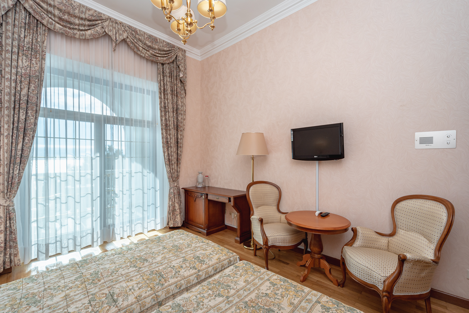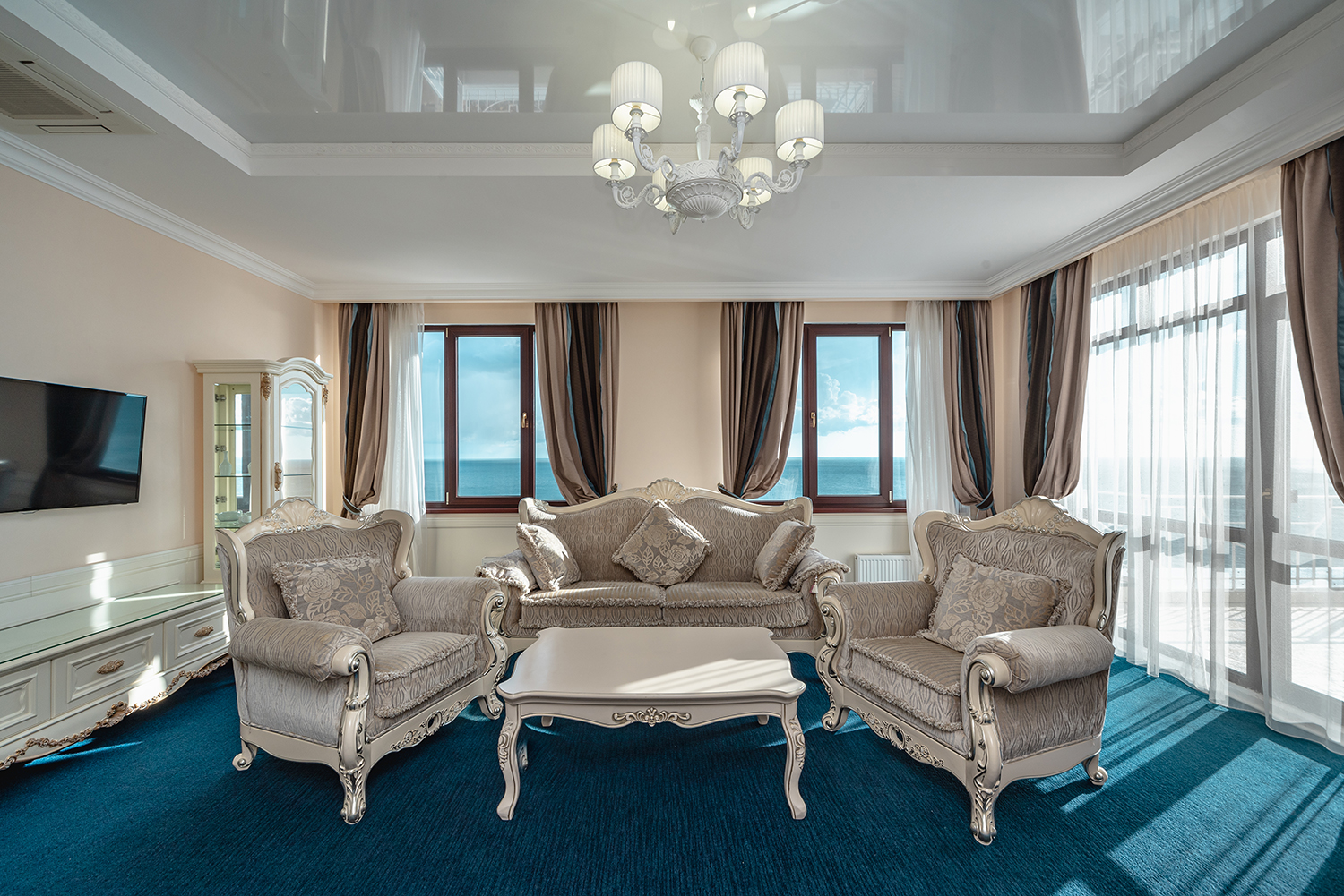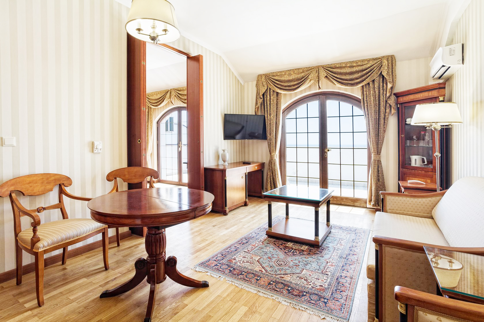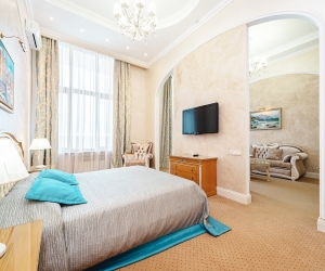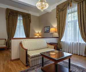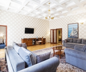 Номер в стиле модерн, обставленный эксклюзивной дизайнерской мебелью, и декорирован старинными вазами, коврами ручной работы. Прекрасный вид на парк «Чаир» и море. Два санузла. Южная сторона. Номер с большим балконом.
