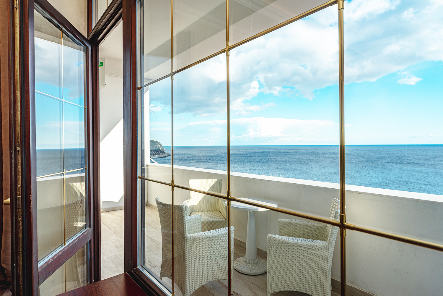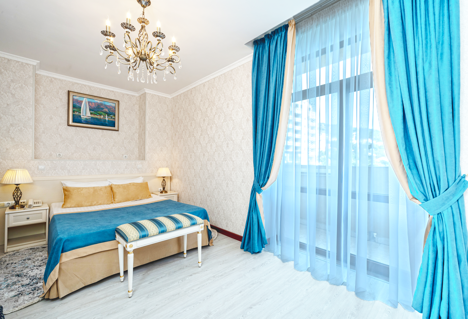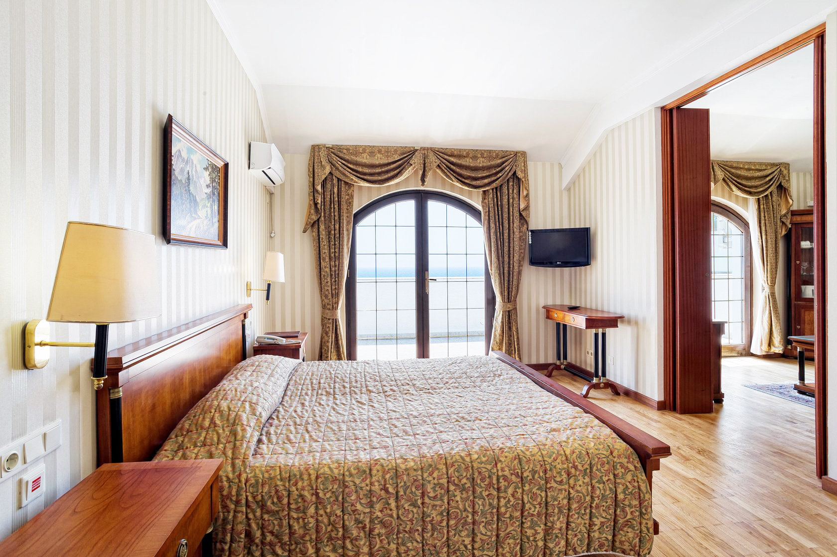 Номер в стиле модерн, обставленный эксклюзивной дизайнерской мебелью, и декорирован старинными вазами, коврами ручной работы. Прекрасный вид на парк «Чаир» и море. Два санузла. Южная сторона. Номер с большим балконом.